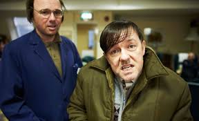 Derek, played by Ricky Gervais, is on the right. The CEO of the fictitious nursing home, a real dunderhead - I'm not allowed to use curse words on this side - asked Derek, who is the most loved attendant in the home and makes everyone feel wonderful - asked him if he was mentally handicapped, then specifically autistic.